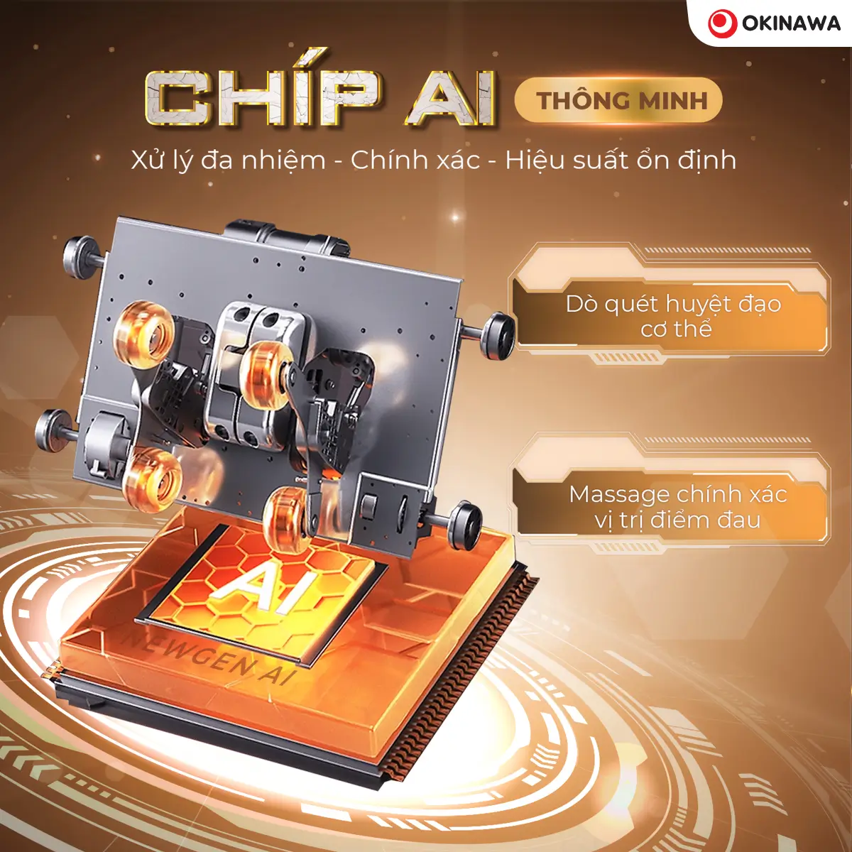 Okinawa NEWGEN AI được trang bị chip AI thông minh với khả năng xử lý đa nhiệm chính xác, mang lại hiệu suất ổn định và hiệu quả massage vượt trội. Công nghệ này không chỉ giúp nâng cao trải nghiệm thư giãn mà còn tối ưu hóa các liệu trình massage, phù hợp với nhu cầu và thể trạng của từng người dùng.