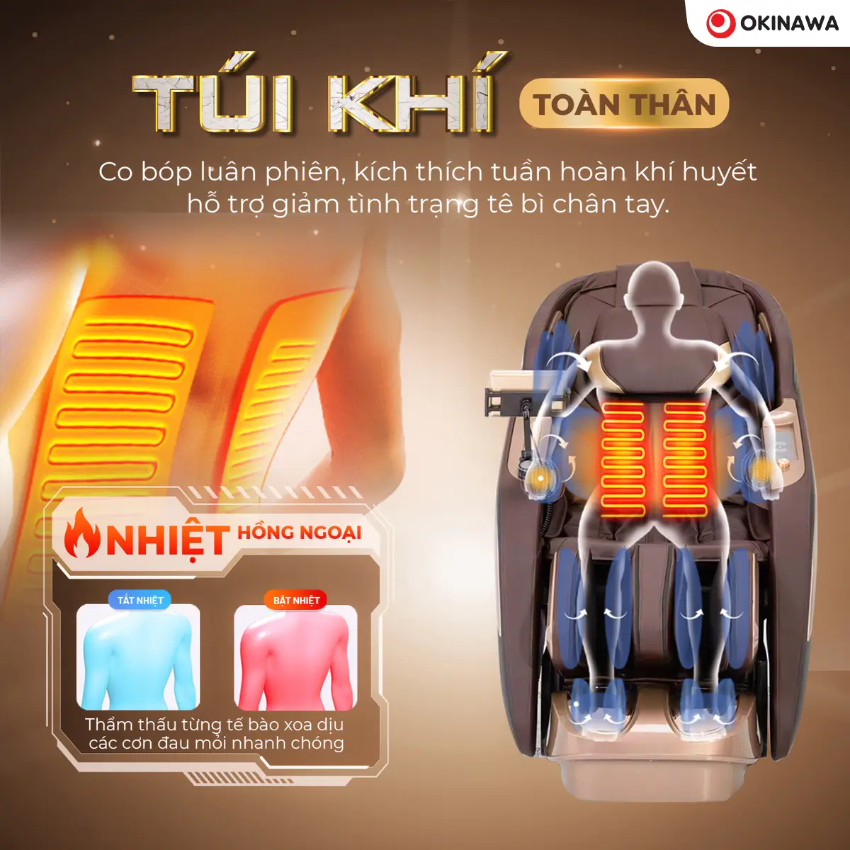 Túi khí toàn thân của Okinawa NEWGEN AI được thiết kế để co bóp luân phiên và bao phủ toàn bộ cơ thể, từ vai, lưng, tay, chân, đến bắp chân.