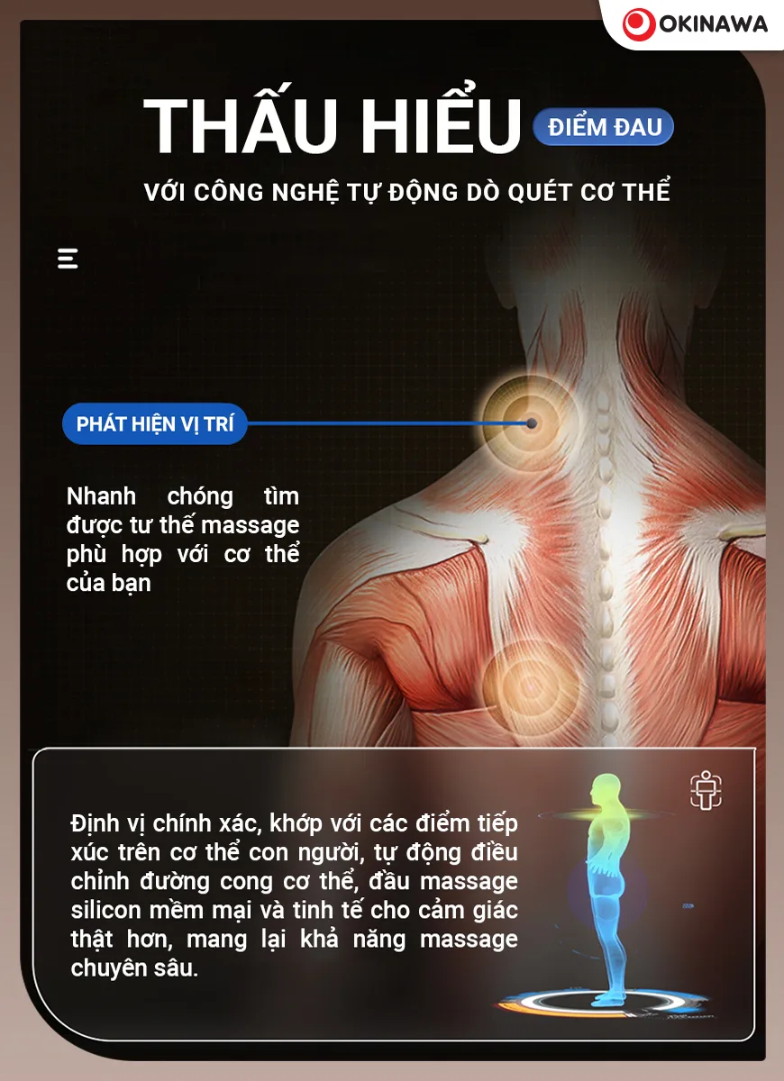 Ghế sử dụng công nghệ dò tìm huyệt đạo, giúp xác định các điểm đau và kích hoạt các con lăn để tác động vào các vùng cơ thể cần được chăm sóc.