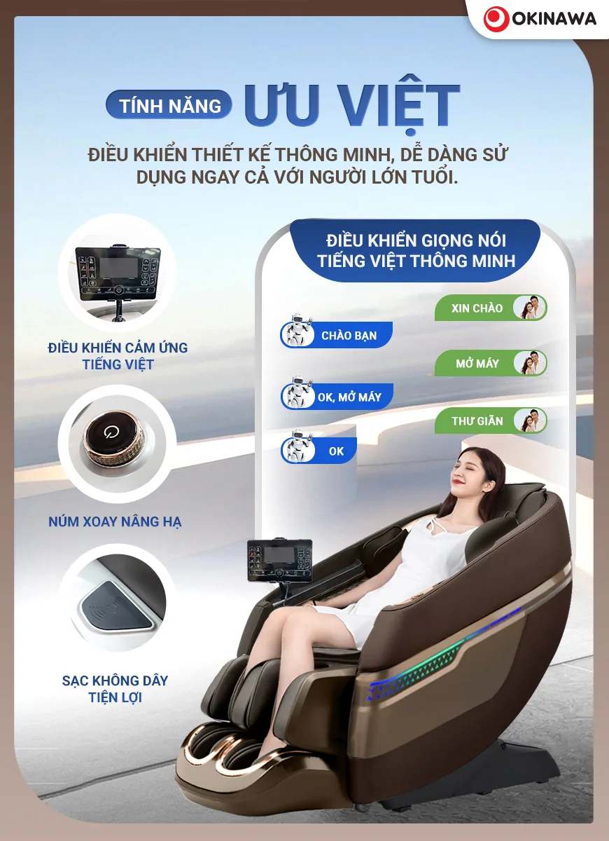 Điều khiển tiếng viêt: Ghế được trang bị bảng điều khiển cảm ứng dễ sử dụng, đặc biệt là hỗ trợ tiếng Việt, giúp người dùng thao tác nhanh chóng và chính xác.