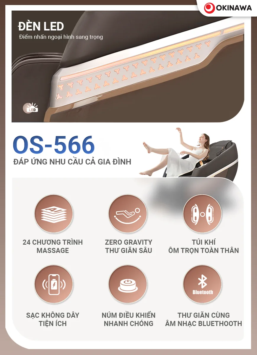 Ghế massage Okinawa OS-566 là món quà tuyệt vời cho sức khỏe của bạn và người thân. Hãy sở hữu ngay hôm nay để cải thiện sức khỏe, giảm căng thẳng và mang lại sự thư giãn tuyệt vời cho gia đình!