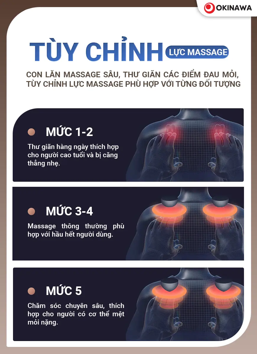 Ghế massage Okinawa OS-566 có 5 mức tùy chỉnh lực, giúp người dùng lựa chọn lực massage phù hợp với nhu cầu cá nhân: