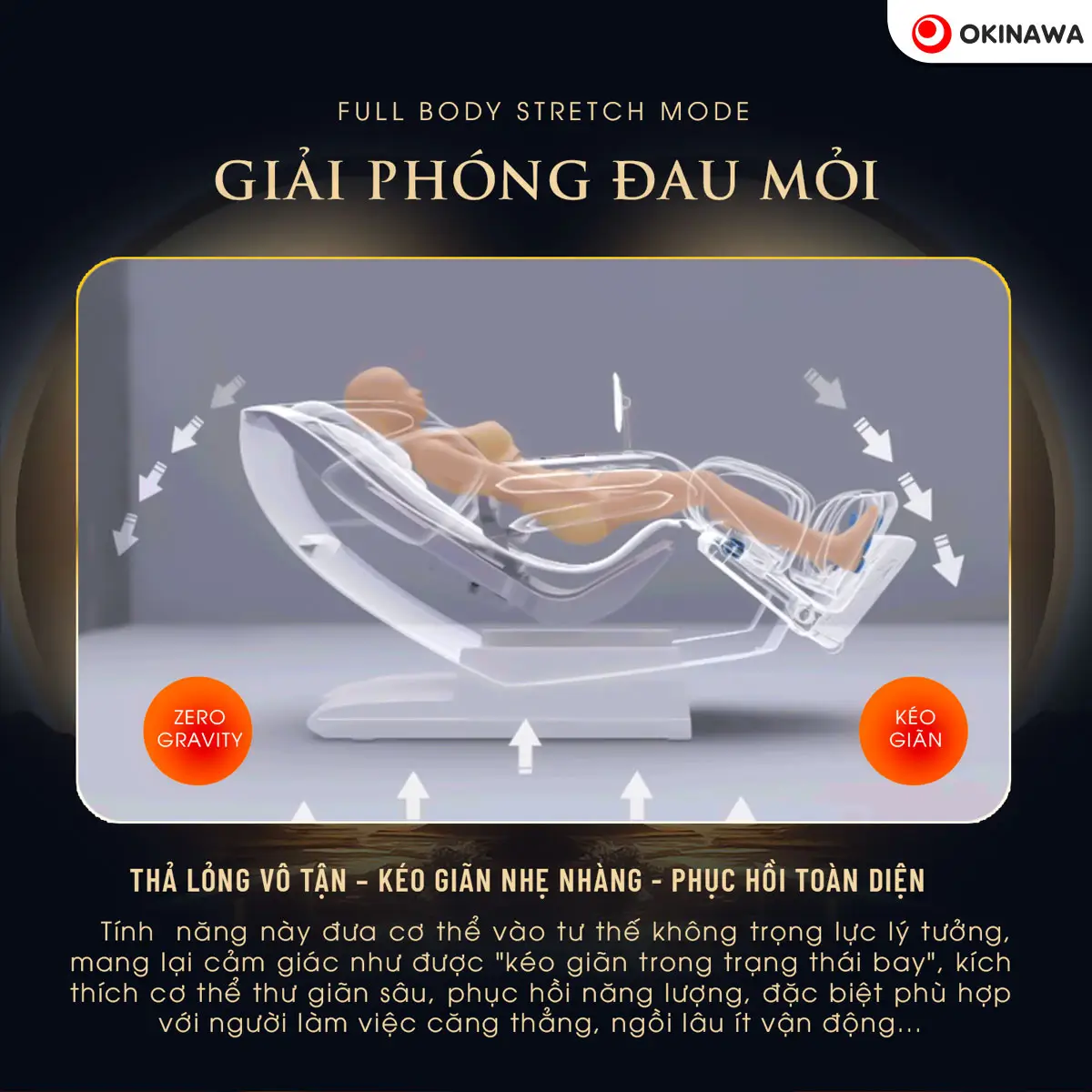 Một trong những tính năng nổi bật của chiếc ghế này chính là Full Body Stretch Mode và tư thế không trọng lực (Zero Gravity) – hai yếu tố giúp bạn thư giãn sâu và tái tạo năng lượng.